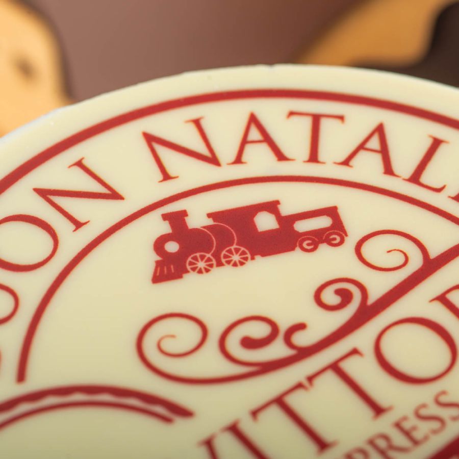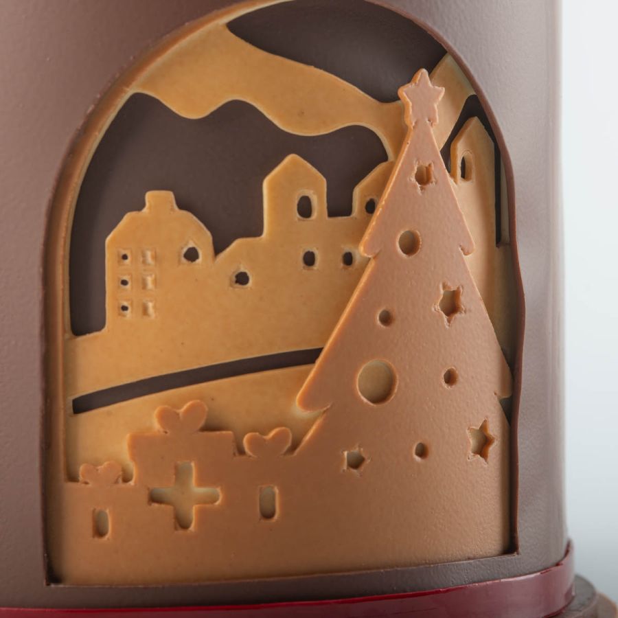 Una confezione regalo interamente di cioccolato, assemblata e incisa a mano, che racconta la storia dei piccoli aiutanti di Babbo Natale. Due finestre lasciano intravedere al suo interno ilpiù classico dei prodotti firmati Da Vittorio: il panettone, ricoperto di finissimo cioccolato.