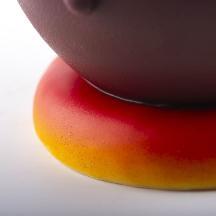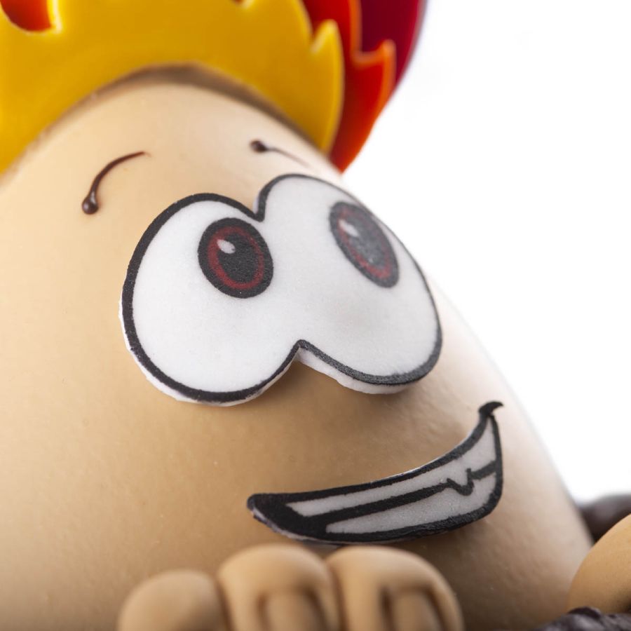 Questo uovo pasquale è realizzato in pregiato cioccolato fondente, con una decorazione fiammeggiante che richiama energia e passione.
