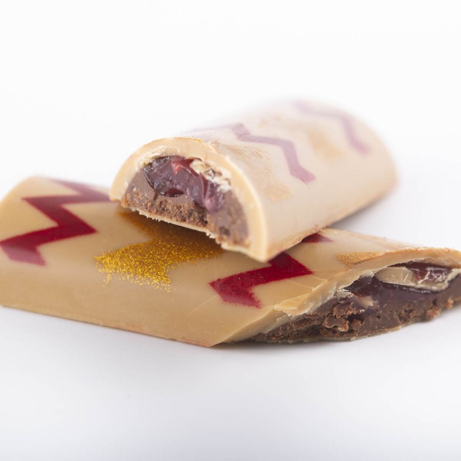 The central snack consists of caramel white chocolate enclosing a hazelnut cremino made from roasted Piedmont IGP hazelnut praline, enriched with milk chocolate and crunchy cornflakes. The raspberry caramel adds a delicate, slightly tart, fruity note that perfectly balances the roundness of hazelnuts.