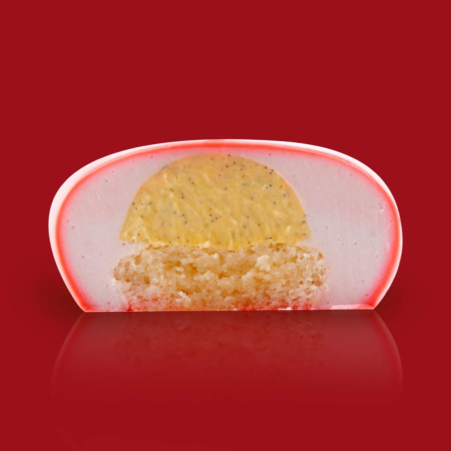 La base amaretto alla mandorla accoglie una vellutata crema alla vaniglia, una soffice chantilly allo yogurt e un tocco di amarene, che regalano freschezza e un piacevole contrasto di sapori.