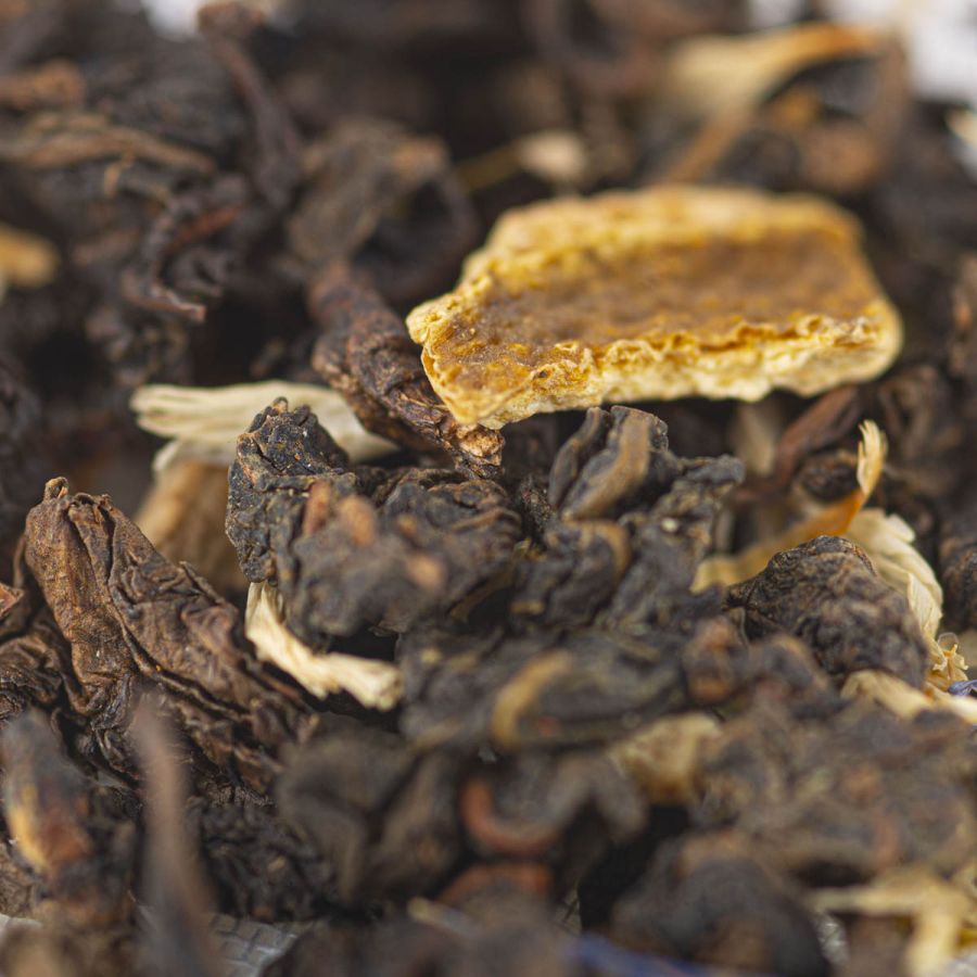 Tè Oolong cinese, scorza d’arancia, fiori di gelsomino, fiordaliso, aromi naturali.