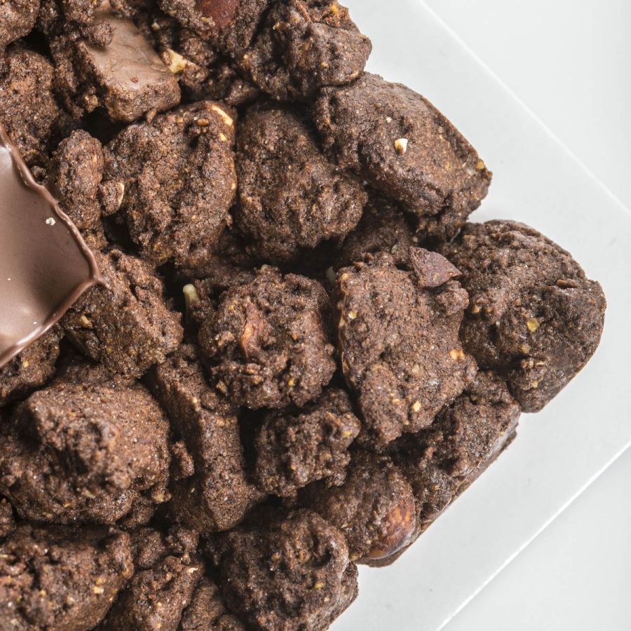 Farina di grano tenero, burro (latte pastorizzato, fermenti lattici), zucchero, mandorle naturali, cioccolato di copertura fondente (10%) (cacao min. 70%) (pasta di cacao, zucchero di canna, burro di cacao, lecitina di girasole), specialità a base di nocciole e cacao (zucchero, nocciole, fave di cacao, burro di cacao, latte intero in polvere, estratto naturale di vaniglia), uovo pastorizzato, farina di mais, cacao in polvere, agente lievitante in polvere (agenti lievitanti: E450i, E500ii, amido, correttori di acidità: E341i, E327), sale.